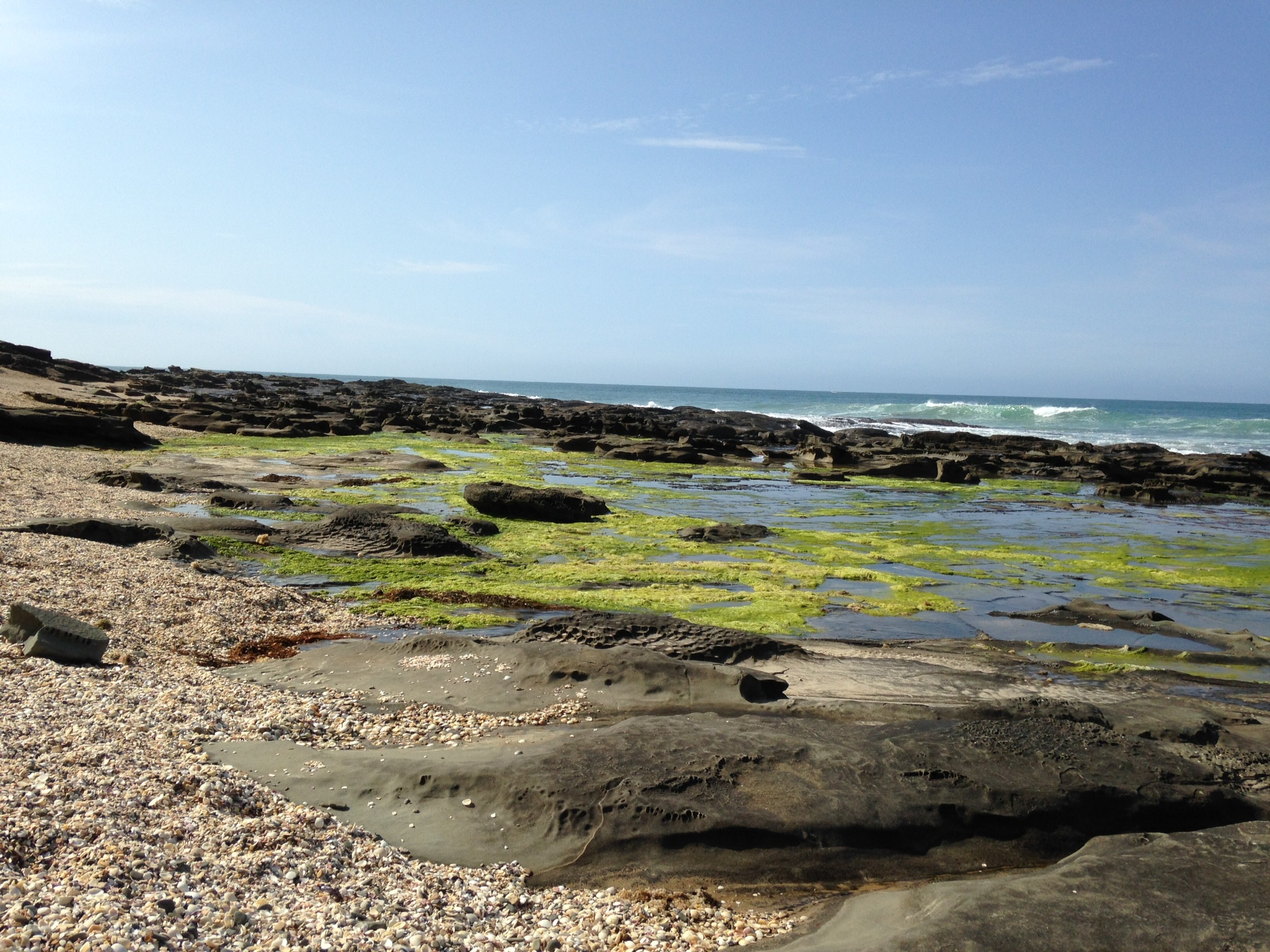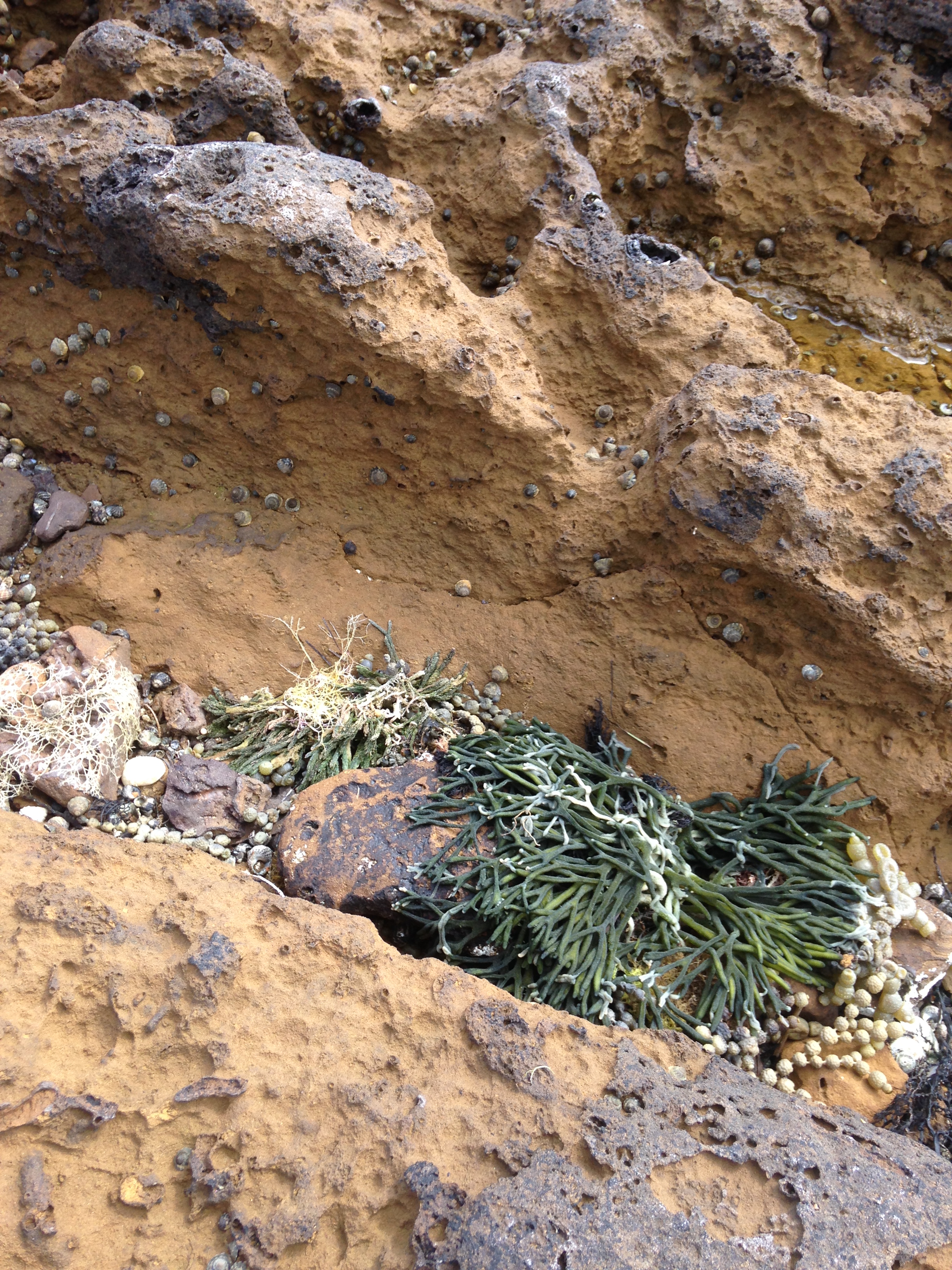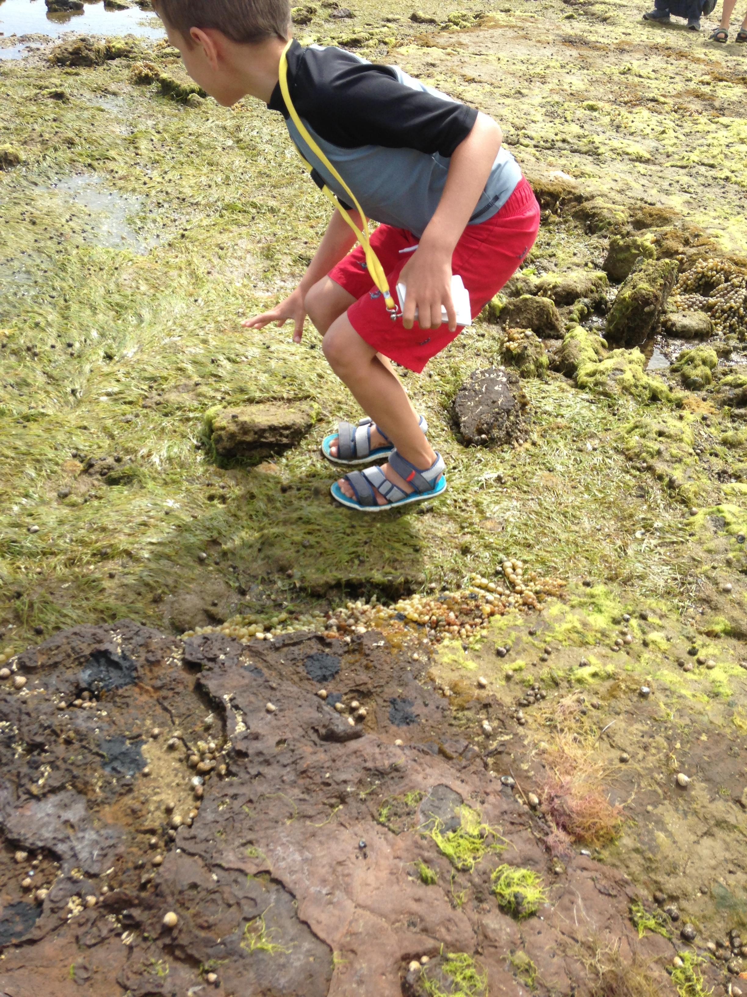 Bending over, Julia picked up a piece of a plant strewn all over the rock shore. Its color was a washed-out olive green, and it was segmented into beads. “Neptune’s Necklace,” she said. Showing us how they stay alive during low tide, she squeezed one of the beads in between her two fingers: a stream of water squirted out. “Oh yeah,” said one of the boys, a curly-haired know-it-all, “I do that to my dad all the time!”