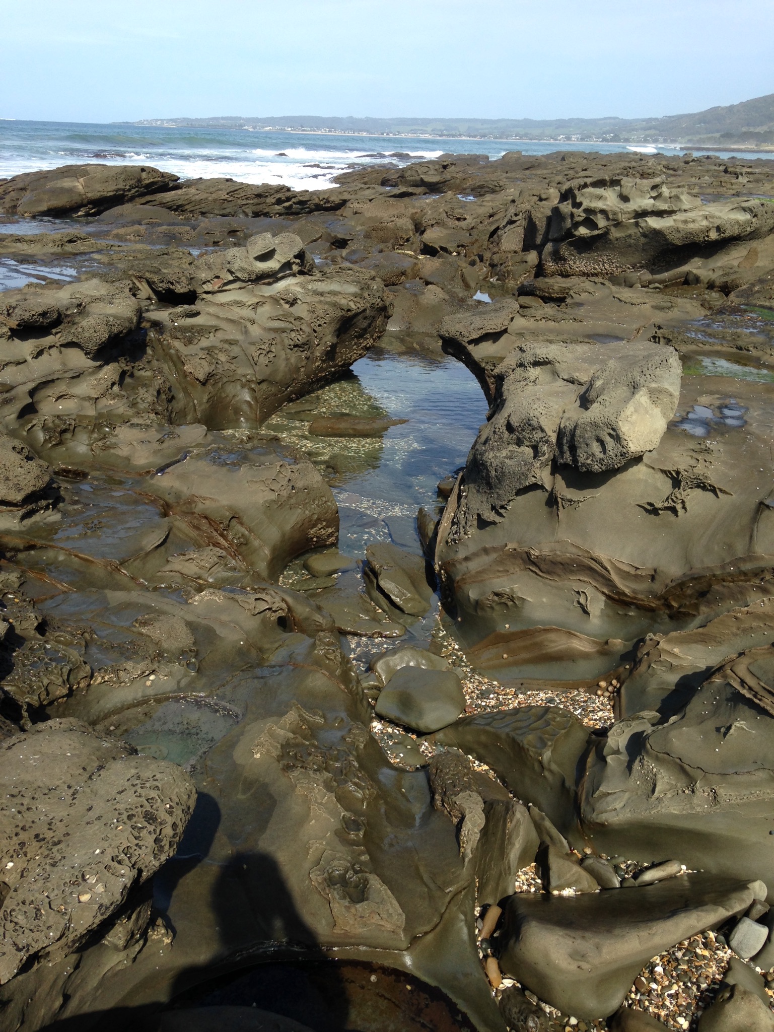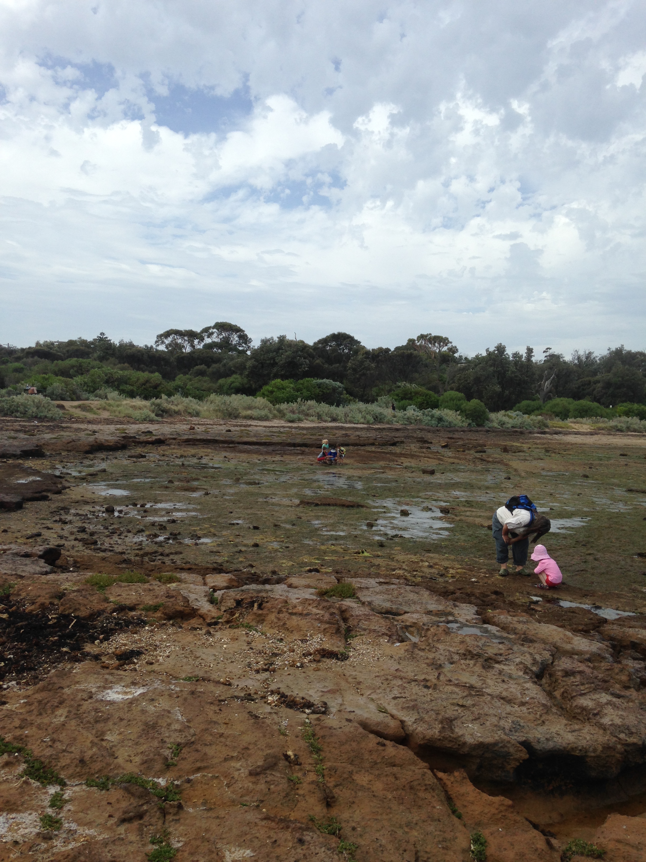 This week, the kids and a couple of friends joined a Parks Victoria program to explore this intertidal reef. The Parks Victoria ranger, Julia, led us out from the parking lot, down to the beach. The kids and their parents fanned out as we reached the rock pools, but Julia soon called us back. As we gathered close to her, she passed around a small handful of this seagrass. She pointed out to the water, where a small group of birds swam, necks in the water. They were obviously swans, but I had never seen black ones before: these graceful birds were striking with their black feathers and orange bills. Julia explained a part of the food chain in the intertidal zone, in which these swans eating the seagrass played a pivotal role.